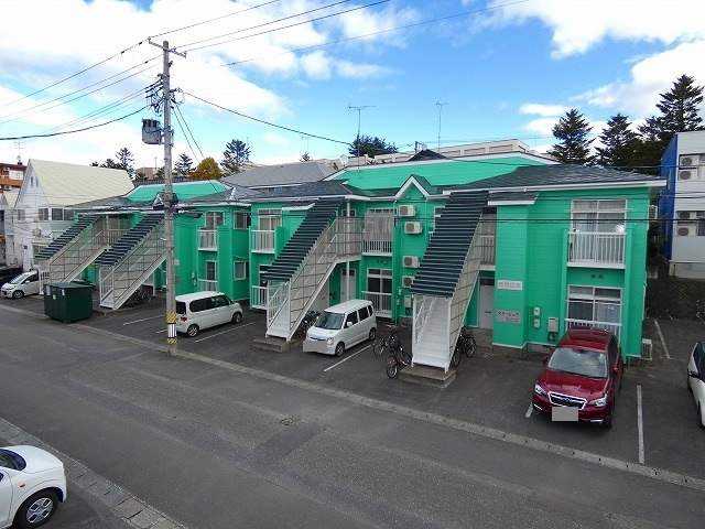 使いやすい間取りの1LDK。駐車場は広々しています。春になると桜並木が見えます。エアコン・FFストーブ・洗面化粧台など充実した設備です。
